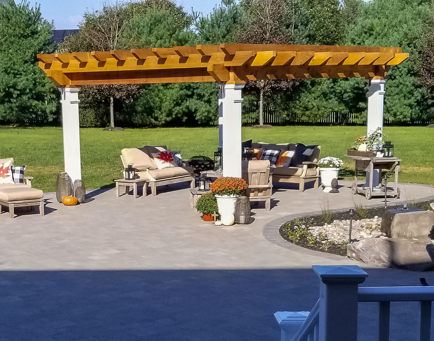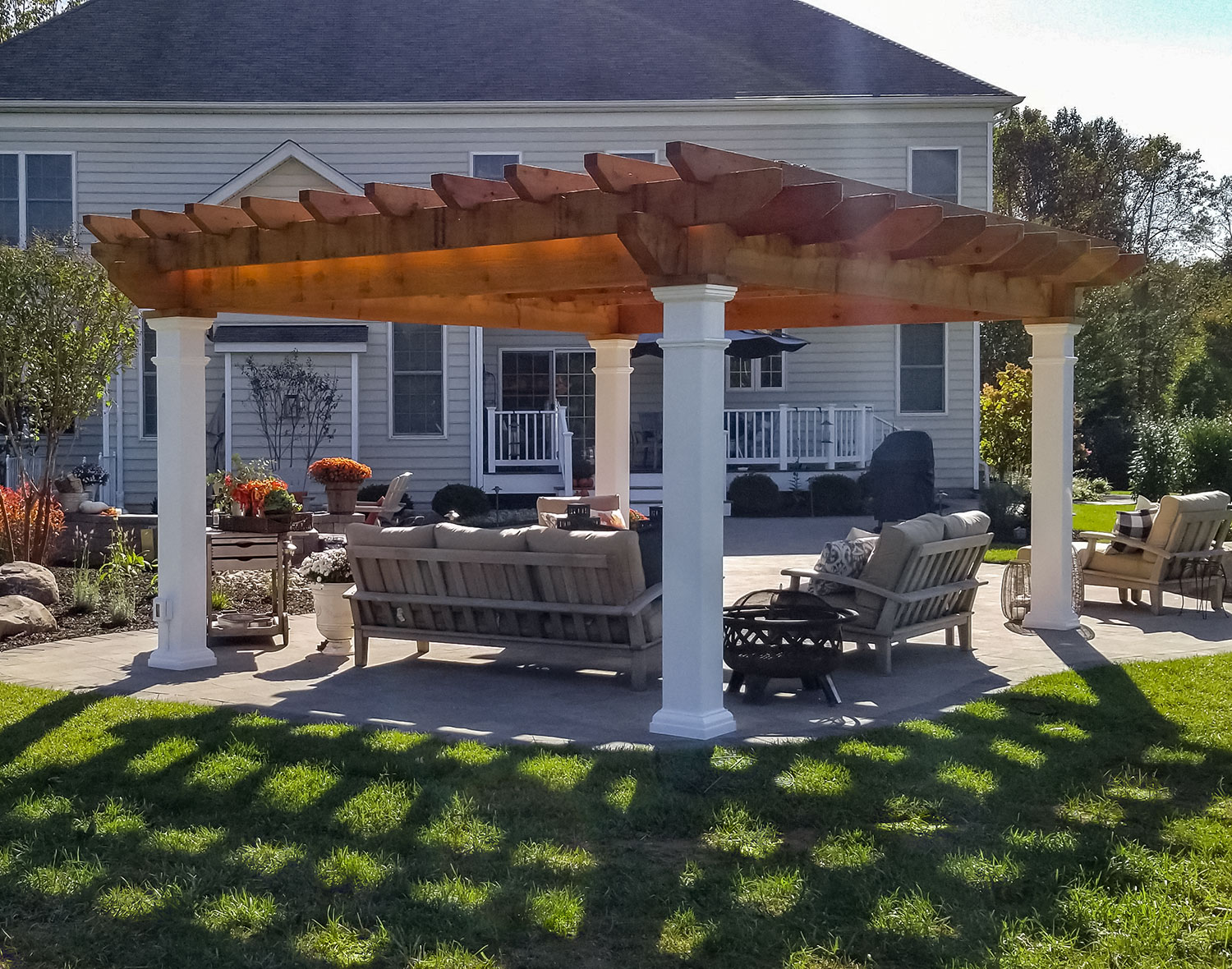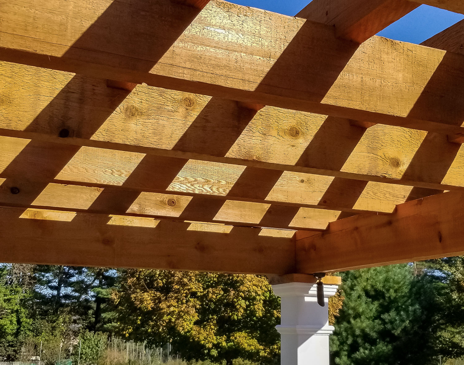 12' x 16' Rustic Solace Pergola shown with Clear Stain/Sealer, Stainless Steel Hardware, 16" Top Runner Spacing, and Customer Supplied Lighting Kit.