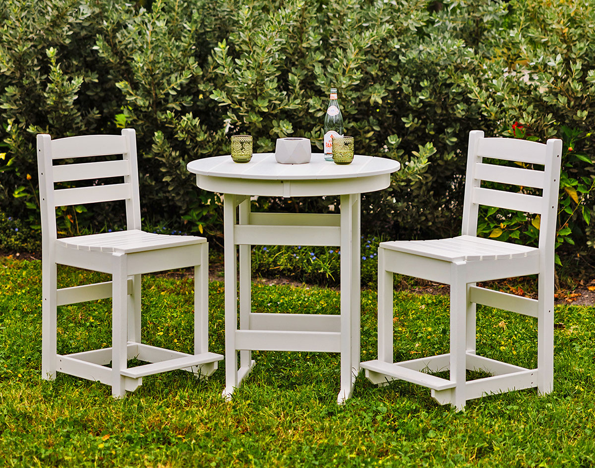 Poly Lumber Bayside 33" Round Table shown at Counter Height in White with 2 Poly Lumber Bayside Side Chairs (sold separately)