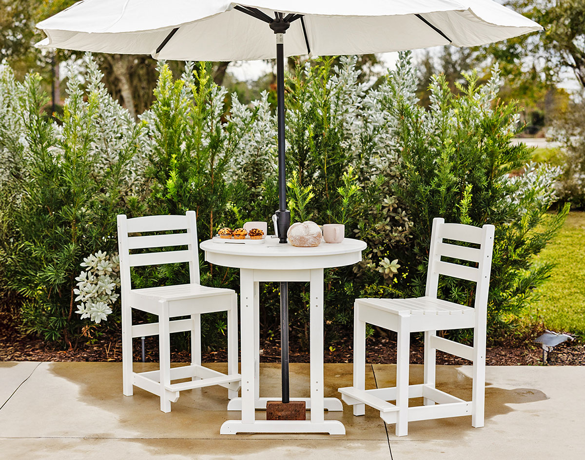 Poly Lumber Bayside 33" Round Table shown at Counter Height in White with 2 Poly Lumber Bayside Side Chairs (sold separately) and umbrella (sold separately)