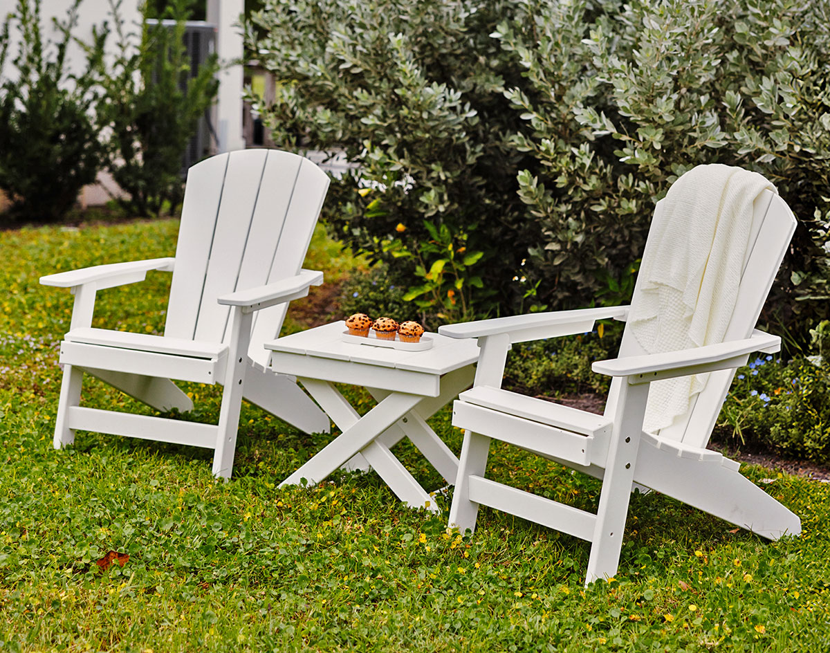 Poly Lumber Bayside Folding End Table shown in White with 2 Poly Lumber Bayside Adirondack Chairs (sold separately)