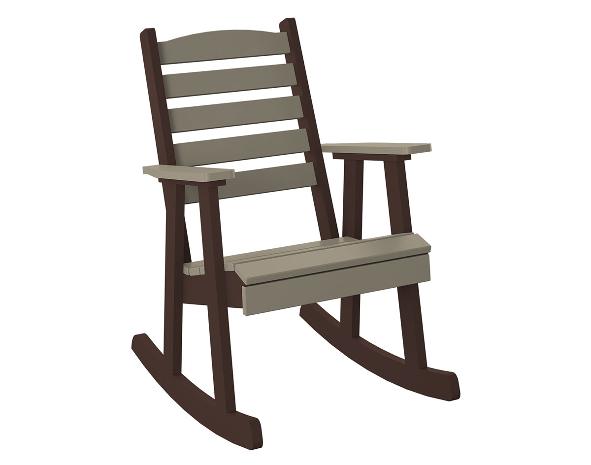 Poly Lumber Bayside Slat Back Rocking Chair shown in Weatherwood / Tudor Brown