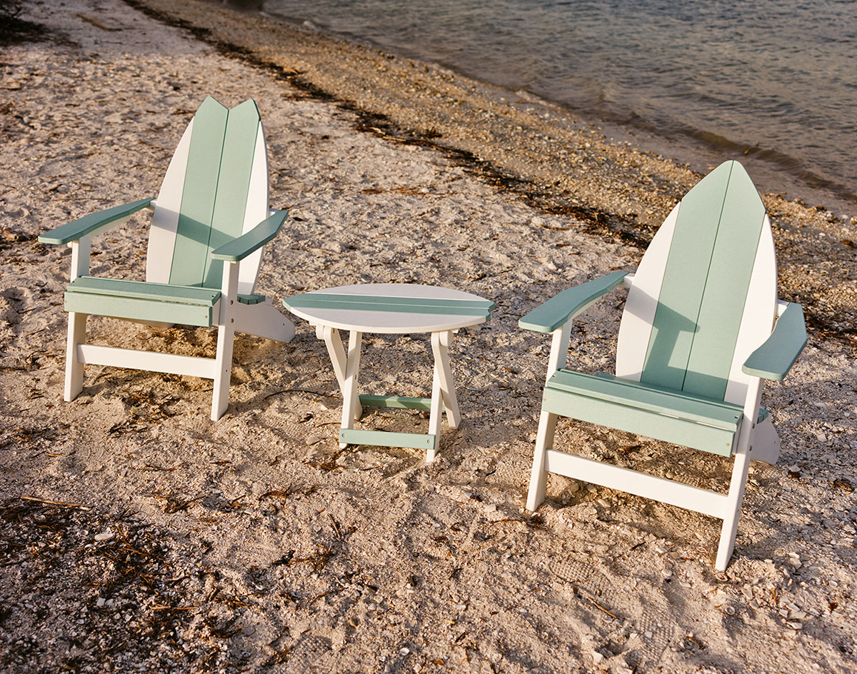 Poly Lumber Bayside Folding Surfboard End Table shown in Sage / White with 2 Poly Lumber Bayside Surfboard Adirondack Chairs, 1 nose and 1 tail style (sold separately)