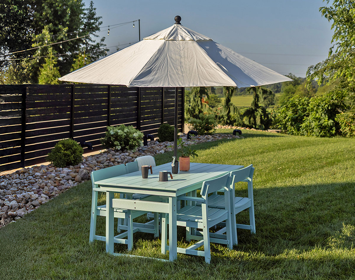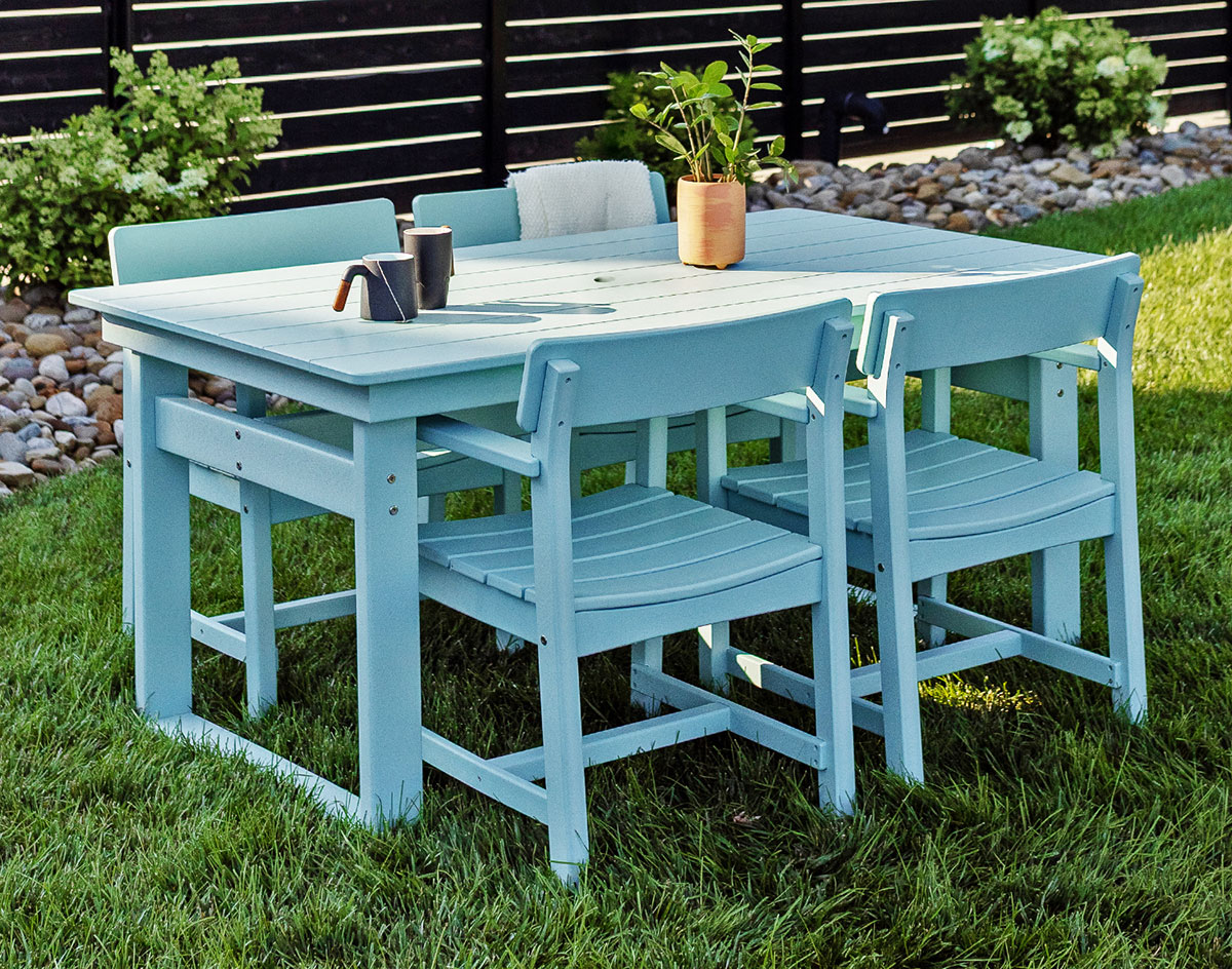 4 Poly Lumber Bayside Club Dining Chairs shown at Regular Height in Sage with Poly Lumber Bayside Modern 38" x 74" Table (sold separately) and umbrella (sold separately)