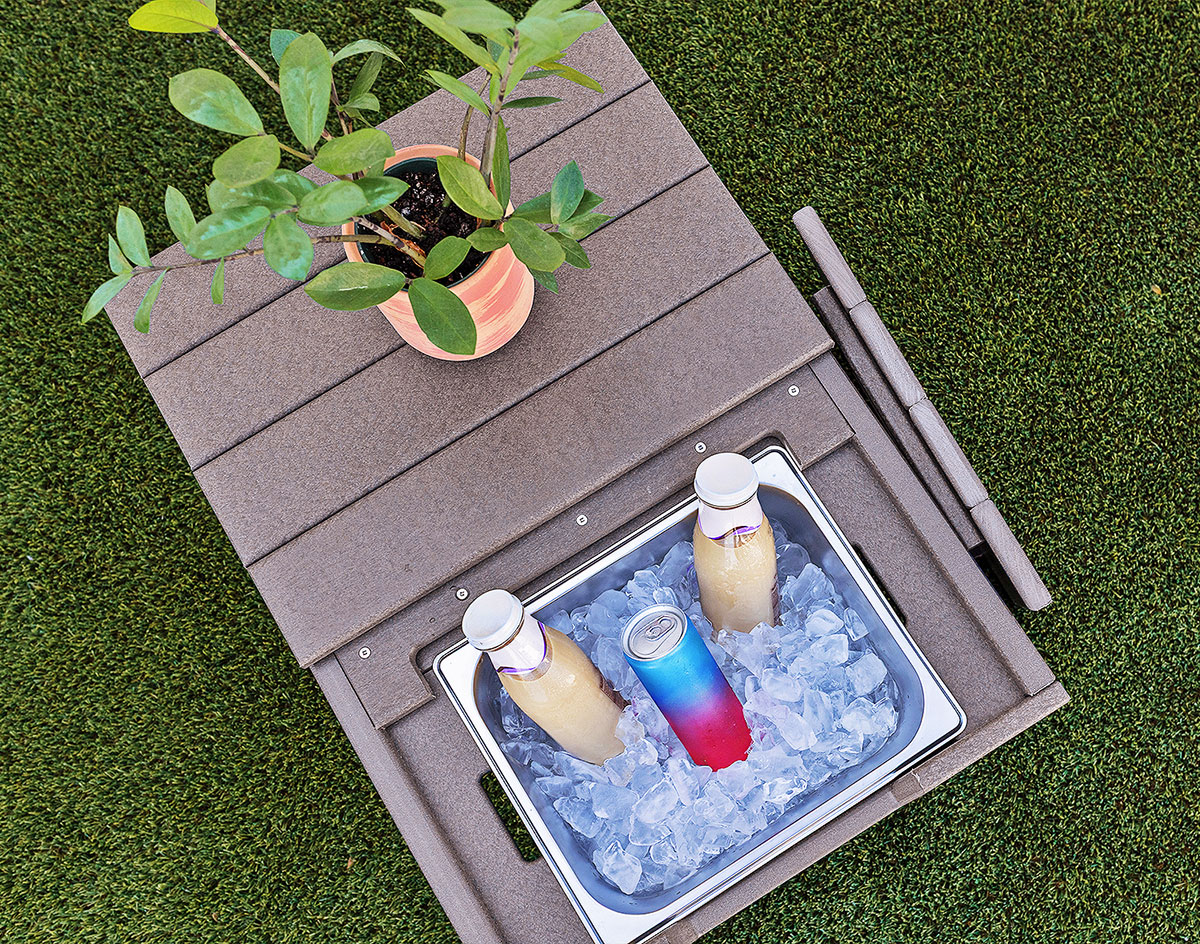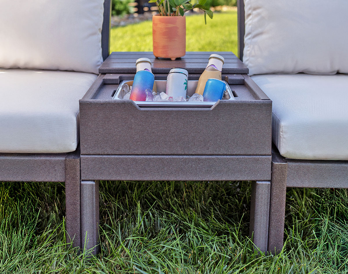Poly Lumber Bayside Breeze Deep Seat Storage/Ice Table shown in Coffee with open ice box (shown with customer-supplied metal ice bin)