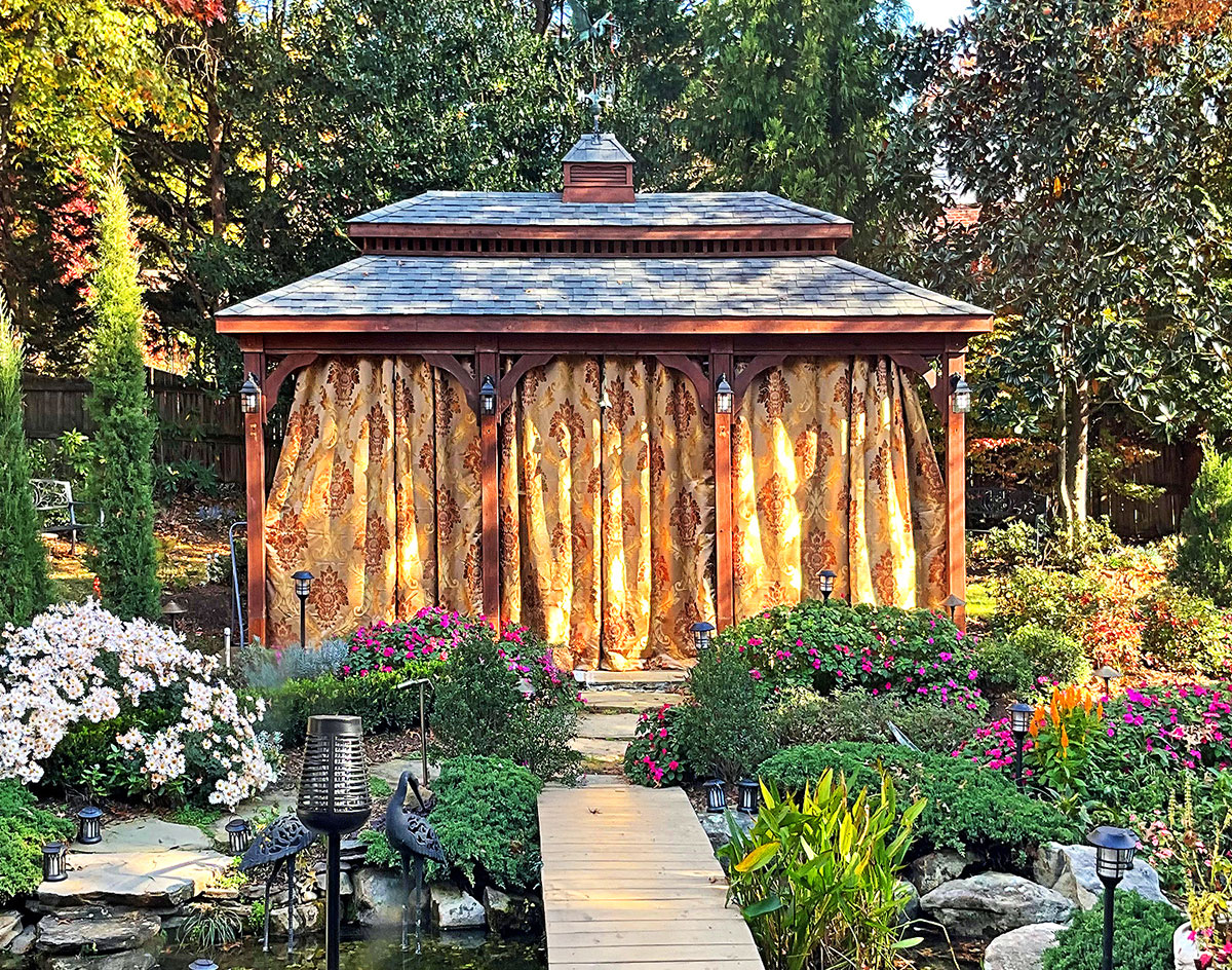 10' x 20' Double Roof Cedar Ramada shown with Cedar Tone Stain/Sealer, Custom 6" x 6" Posts, Short Post Trim, 6" Taller Posts, Functional Cupola, Old English Pewter Asphalt Shingles, Heron Weathervane (45" Verdigris Copper), and 2 Additional Posts. Custom fabric curtains added by customer.