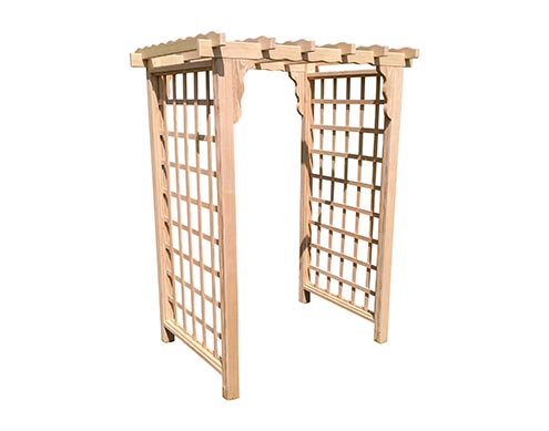 Enjoy exploring our many options in style, size, and structure. Flat top and arched garden arbors are equally durable for outdoor use, so keep in mind which shape will better suit the flow of your home’s architecture. Consider completing a wood arbor with a porch swing, benches, or gates. Another pleasant decision is whether to bring your arbor to life with wisteria, morning glories, or other floral displays, or to let the architectural beauty of the arbor itself steal the spotlight.